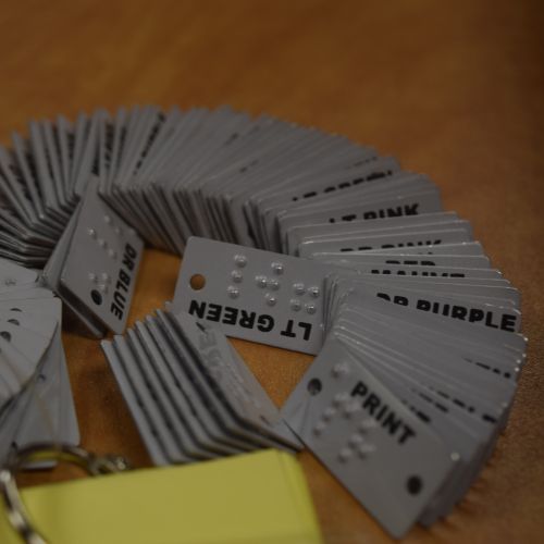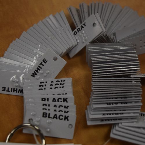 Braille Clothing Labels (All Colors): This set of one hundred labels includes eight black, eight dark blue, eight red, eight white, four light blue, four brown, four dark green, four light green, four gray, four mauve, four orange, four dark pink, four light pink, four dark purple, four light purple, four teal, four tan, four yellow, four plaid, four print, and four striped tags.